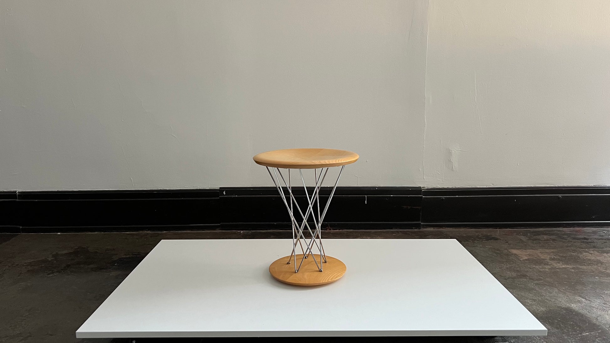 Isamu Noguchi iconic rocking stool in blond wood with polished chrome accents, 14” diameter x 17”high. Vitra production. Short dark example not included, available in a separate listing.
