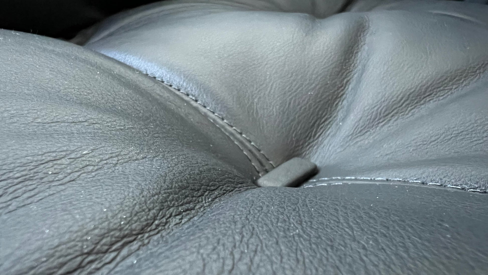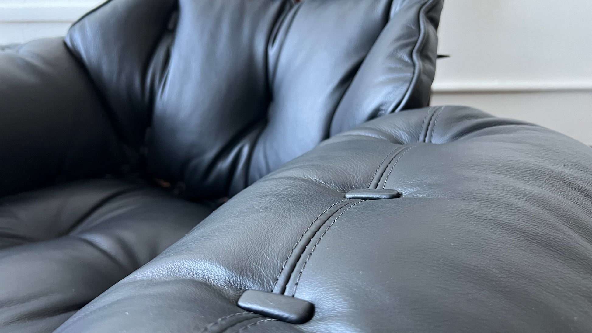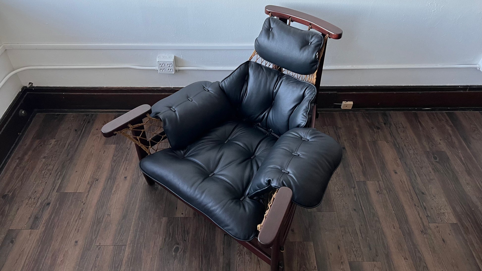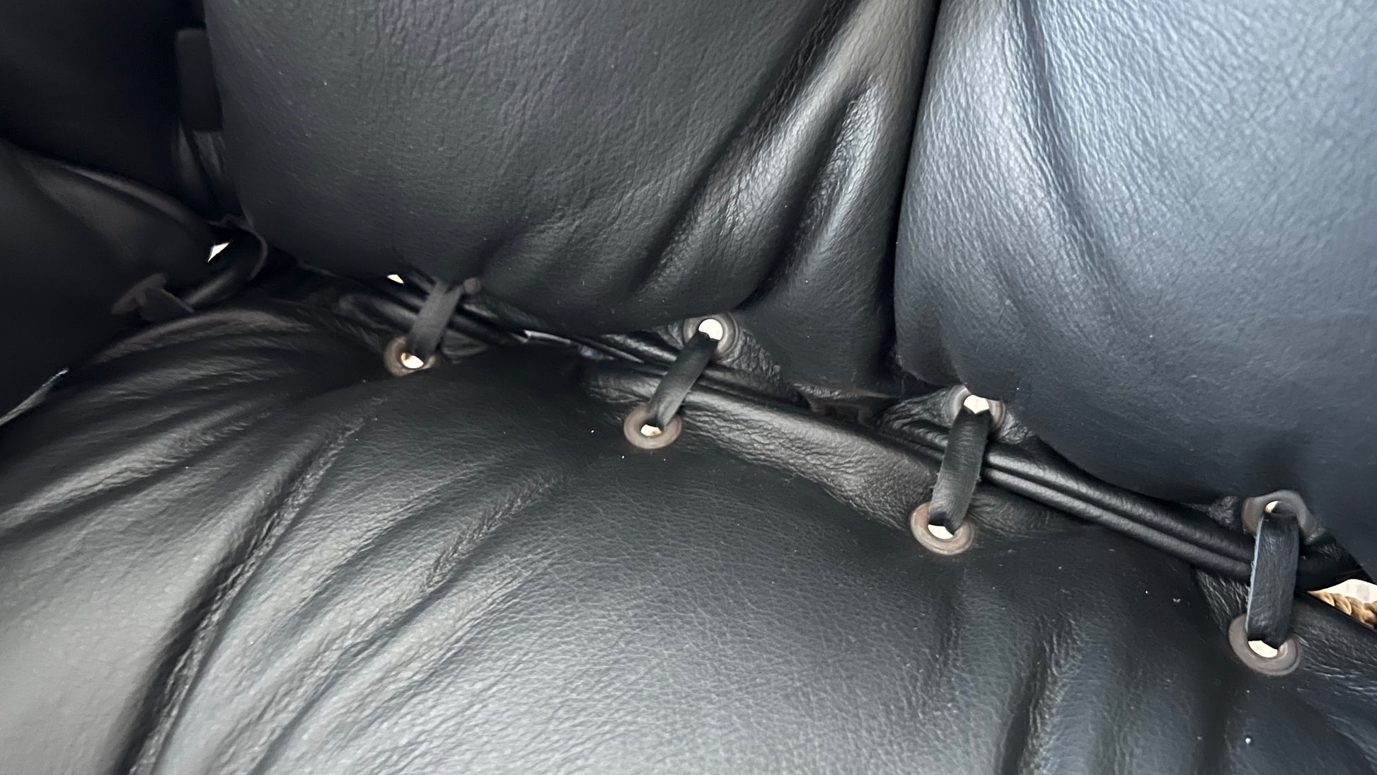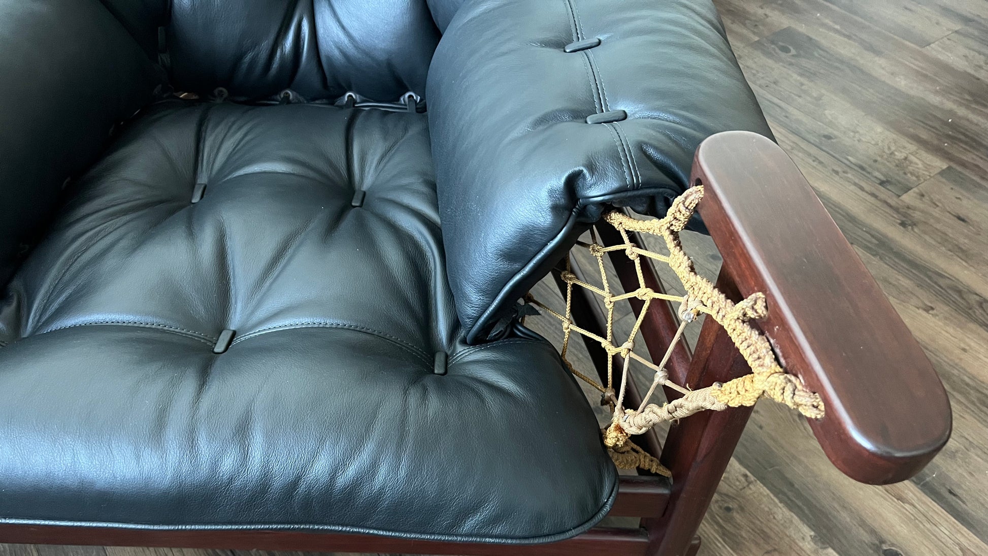Reupholstered in supple black leather, special attention was paid to the buttons and finishes of the cushions. The frame was restored, with conservation in mind, to repair the loss of finish in certain areas.